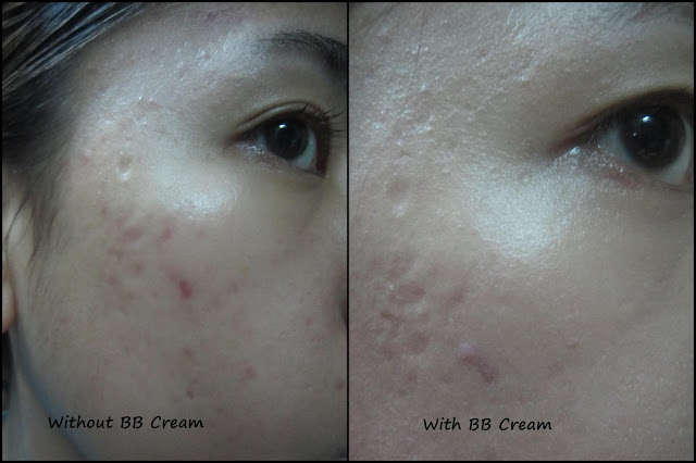 The lest side shows the part of my face with Tonymoly Expert Triple BB Cream. The right side shows the part of my face WITHOUT the BB cream.